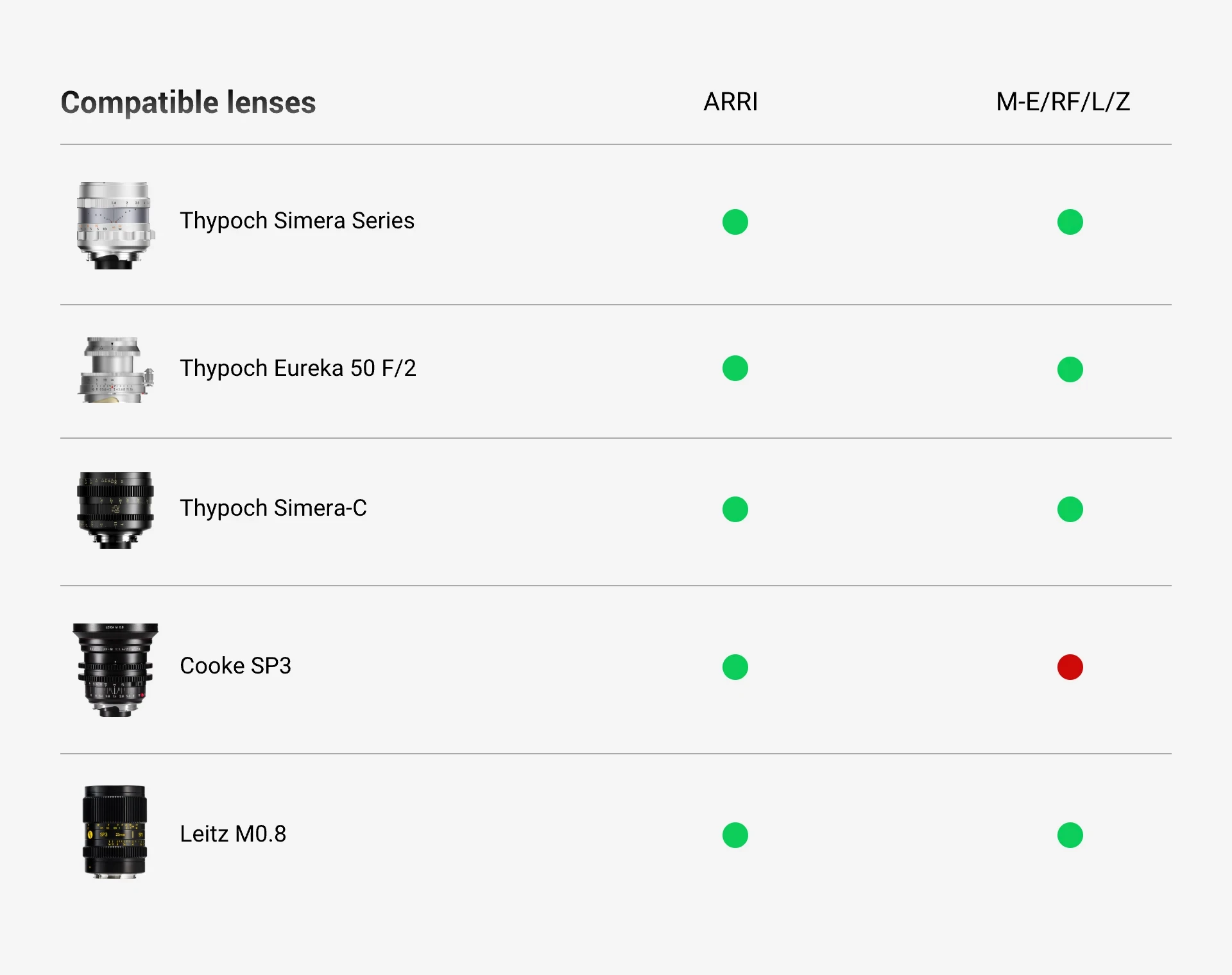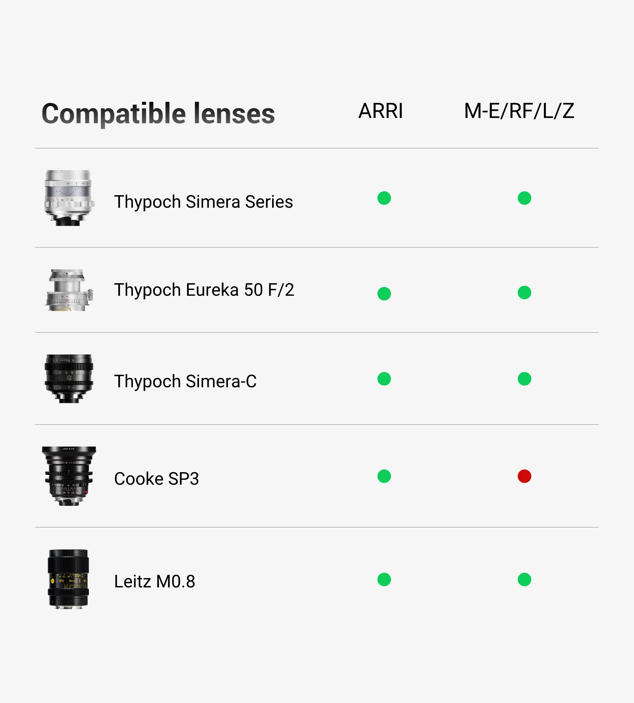 With a short flange distance of just 27.8mm, the Leica M-mount offers exceptional adaptability. Thypoch adapters cover a wide range of mounts including M-E, L, Z, RF, and ARRI, supporting multi-system use from mirrorless cameras to professional cinema rigs. They easily fit major mirrorless systems like Sony, Canon, Nikon, Panasonic, as well as cinema cameras such as RED and ARRI.