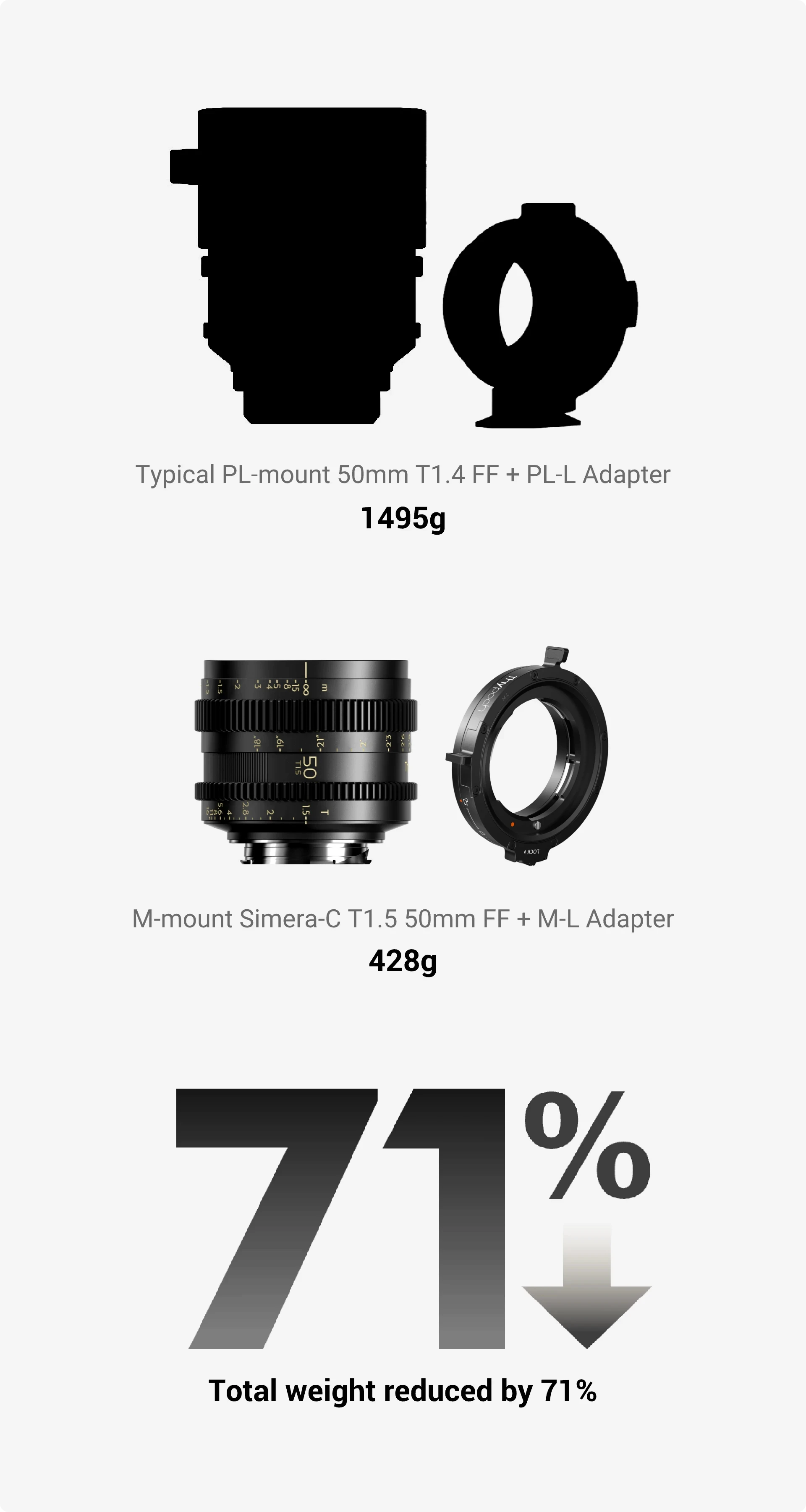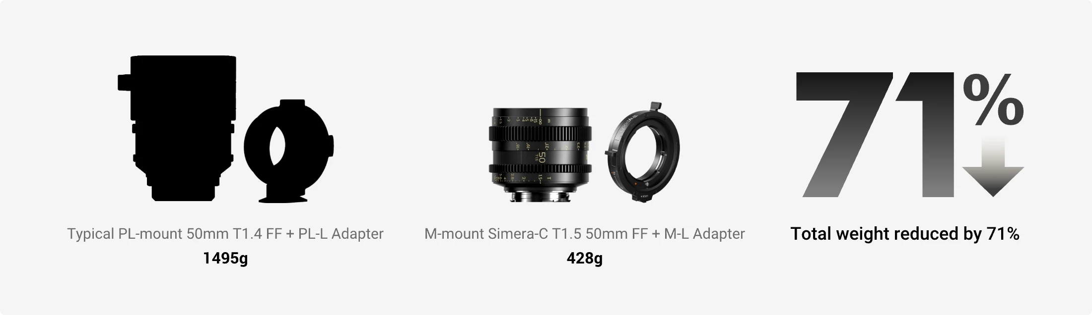 The compact design of the M system makes M mount lenses smaller and lighter than many modern cinema lenses. For example, the Simera-C T1.5 M-mount lenses weigh only 353–472g, and when paired with the Thypoch positive-lock adapter (75–94g), the total setup is far lighter than a typical PL system, which weighs around 1300–1800g (lens + adapter). This represents a weight reduction of over 70%, while maintaining exceptional optical performance. Whether for extended handheld shooting, stabilizers, drones, car rigs, or crane jib arms, this lightweight setup reduces load and improves handling balance and flexibility.